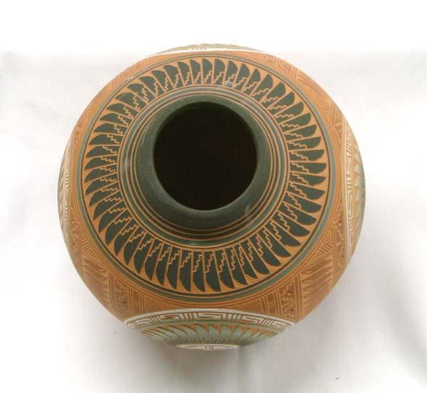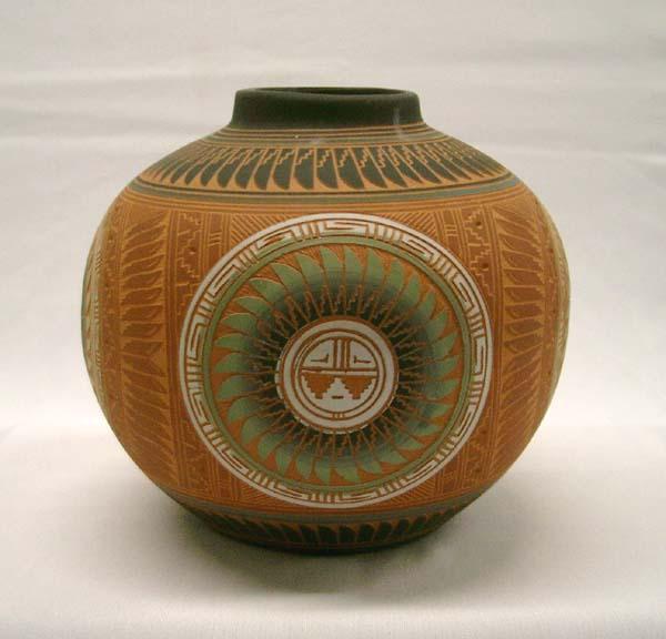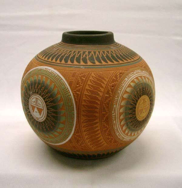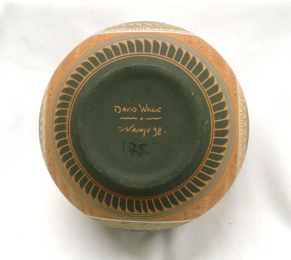 Native American Navajo Jar by David Willie, Polychrome with Finely Etched Sunface/Feather Designs. Measures approx. 6.5''H x 7''Diameter. Buyers Pay Actual Shipping and Handling Charges(see terms and conditions for more information).