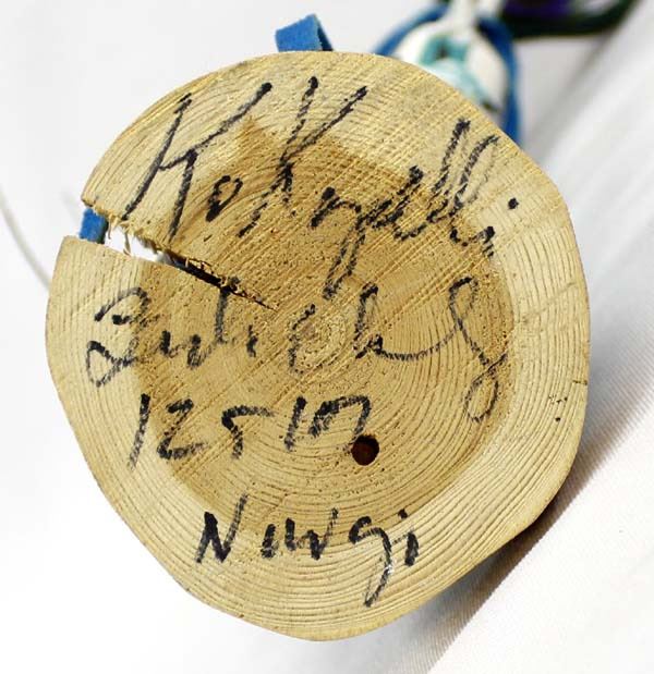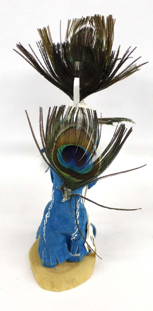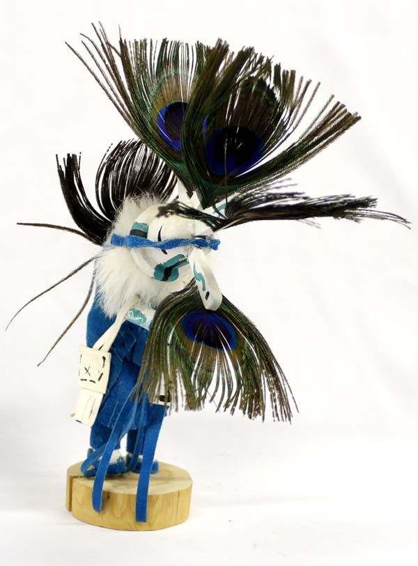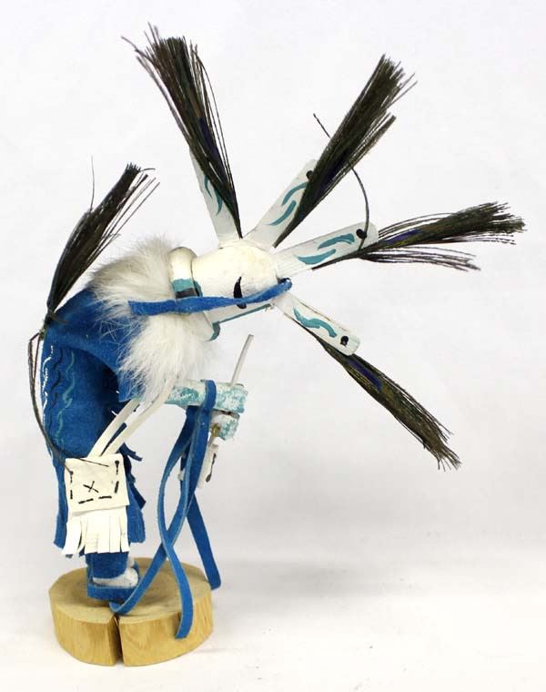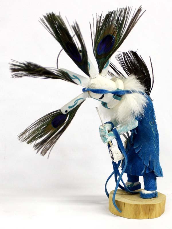Native American Navajo Kokopelli Kachina by F. Charley, measures 11'' x 8'' x 3'' and is signed by the artist, embellished with peacock feathers, rabbit fur, and leather