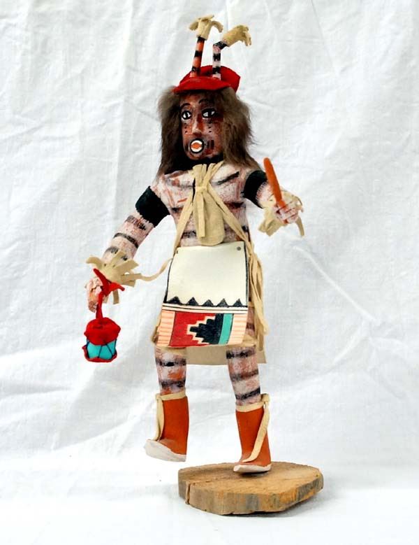 From the Whittredge Estate, we have a Native American Navajo Koshare Clown Kachina, measures 12''H x 6''W x 5''Deep, embellished with leather and rabbit fur, missing right thumb