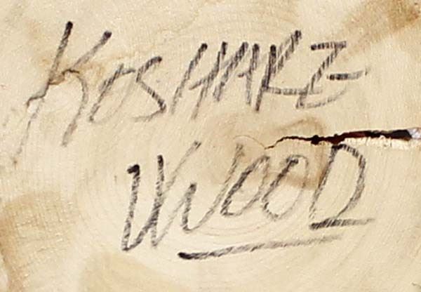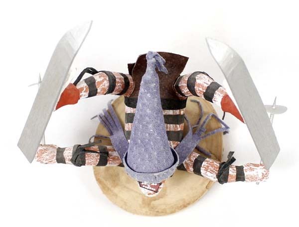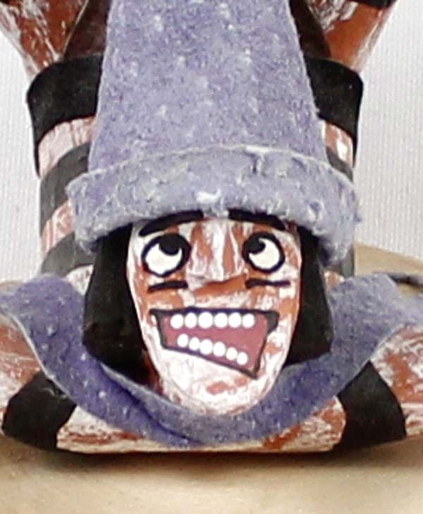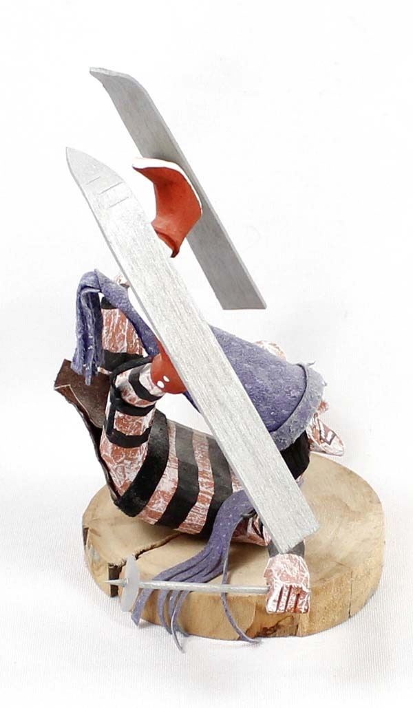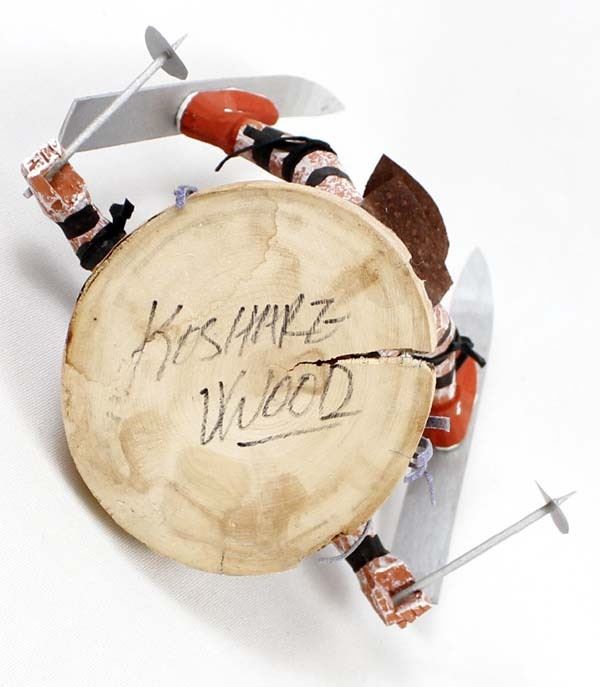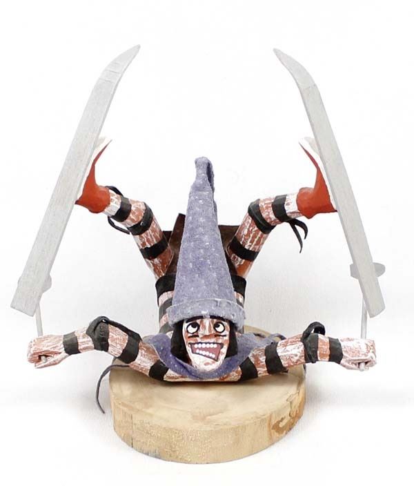 Native American Navajo Koshare Kachina by Virgil Wood, measures 6'' x 4'' x 6'' and is signed on the bottom, this skiing Koshare is embellished with wood skiis, poles, and felt hat and loincloth