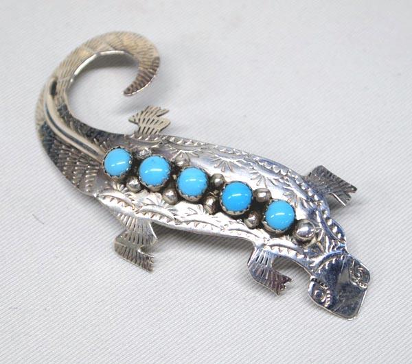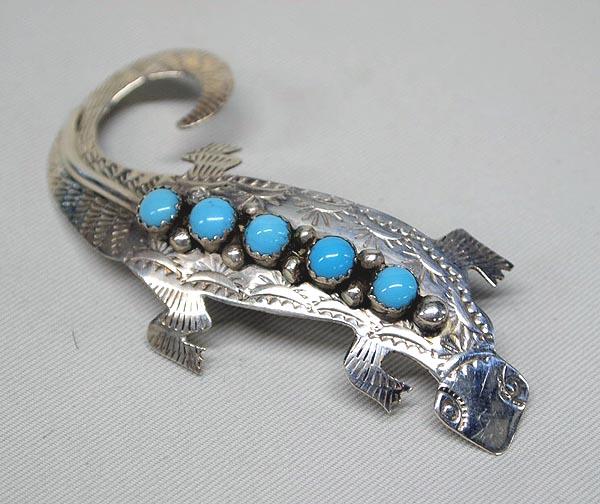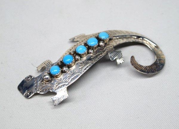 Native American Navajo Silver & Turquoise Lizard Pin by Tim Yazzie, measures 2.75'' x 1.25''. Buyers Pay Actual Shipping and Handling Charges(see terms and conditions for more information).