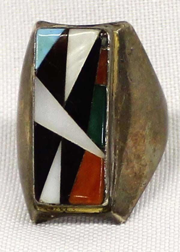 Beautiful Native American Zuni Old Pawn Sterling Inlay Ring, Size 9.5, measures 1.25''L, inlay of mother of pearl, jet, coral, and turquoise, 20.1gtw
