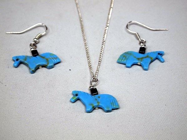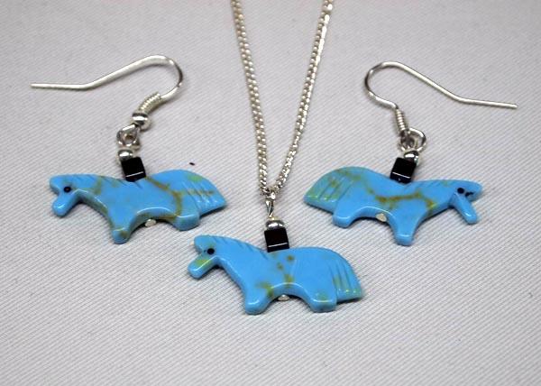 Native American Navajo Silver & Turquoise Horse Fetish Necklace and Earrings Set, necklace measures 16'' long end to end, horse pendant measures .75'' and earrings measure .5'' x 1''. Buyers Pay Actual Shipping and Handling Charges(see terms and conditions for more information).