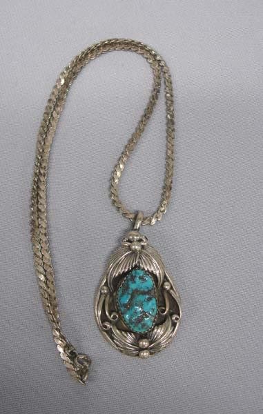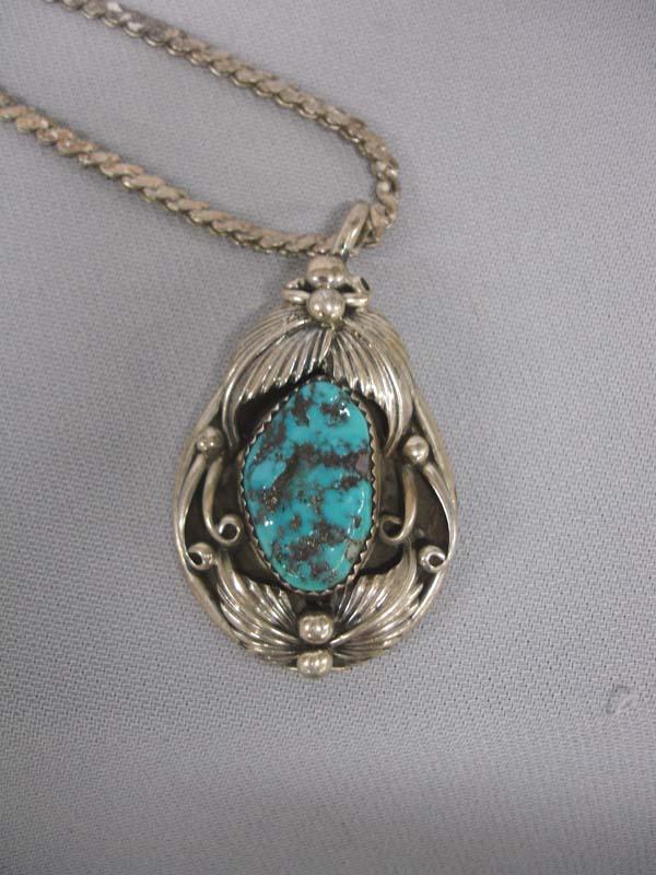 Native American Navajo Silver & Turquoise Necklace by BFG, Hallmarked, Chain measures 17'' and Pendant 2'' x 1''. Buyers Pay Actual Shipping and Handling Charges(see terms and conditions for more information).