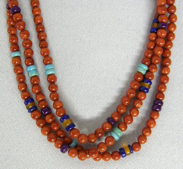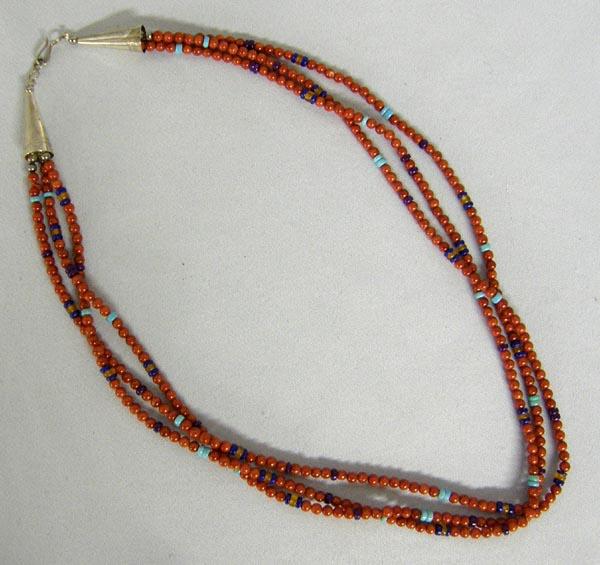 Native American Navajo 3 Strand Coral Necklace With Amber, Turquoise, and Lapis Accent Beads and Sterling Findings, measures 20.75'' end to end. Buyers Pay Actual Shipping and Handling Charges(see terms and conditions for more information).