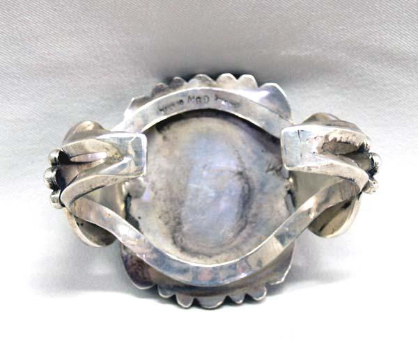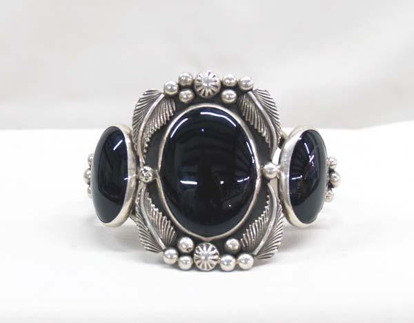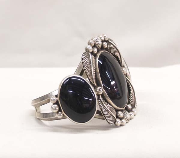 Native American Navajo Silver Onyx Bracelet, hallmarked MGD and stamped sterling and Navajo, heavy, measures approx. 7'' inside, 2.25''W, 3 large onyx stones, largest onyx stone 1.5'' x 1 1/8''. Buyers Pay Actual Shipping and Handling Charges(see terms and conditions for more information)
