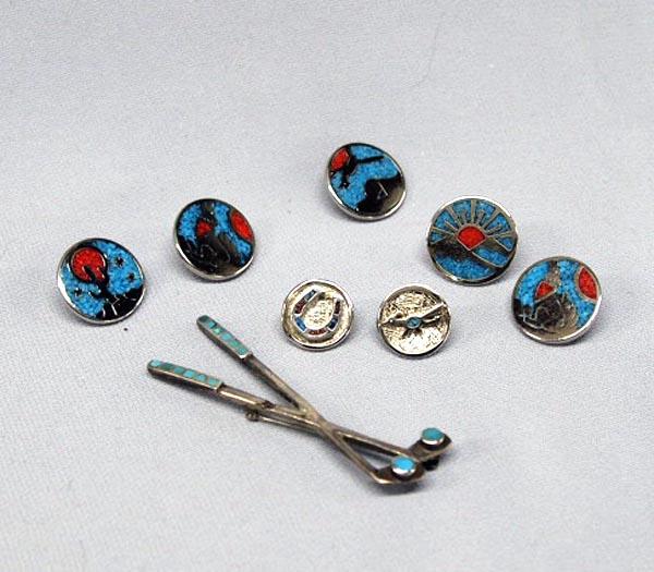 Navajo Silver Turquoise Golf Pin, plus 7 Ball German Silver Golf Tee Markers. The golf clubs pin measures 2.5'' long. 5 markers are 3/4'' diameter (some have hallmarks) and 2 are 1/2''. Buyers Pay Actual Shipping and Handling Charges(see terms and conditions for more information).