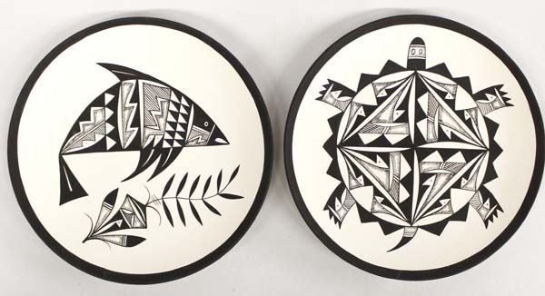 Native American Pottery Plates, 2 plates by Westly Begaye, measures 8'' in diameter, one fish and one turtle, FYI: “Westly Begaye was born into the Navajo Nation in 1965. He was taught by his long time companion, Marie Francis Vallo, an Acoma potter. Westly's work is a fusing of Navajo and Acoma traditions. He has developed his own unique style, giving his pots an amazing contemporary flare.”
