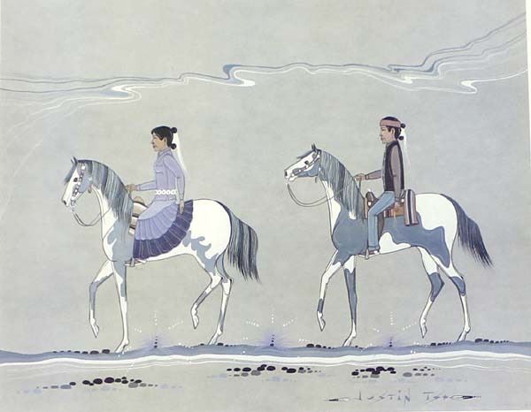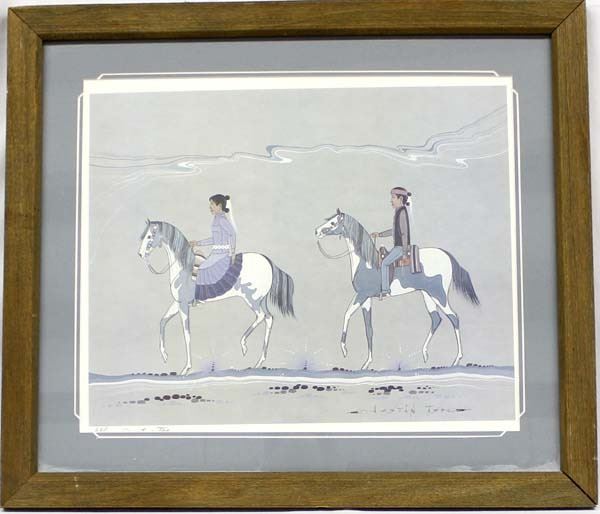 Native American Navajo Print by Justin Tso, professionally framed, matted, and under glass, visual measures 15'' x 18'', hand signed, limited edition #20, FYI: ''(Born 1948) Justin Tso, in the book Navajo Painter of Legends written by Virginia Benderly in 2002, we learn that Tso sold his first painting for $5 at the age of five.'' ''Known for his highlystylized Navajo art, Justin Tso, was born and raised in Canyon de Chelly, Arizona.''