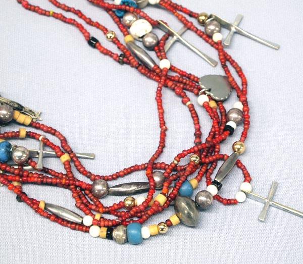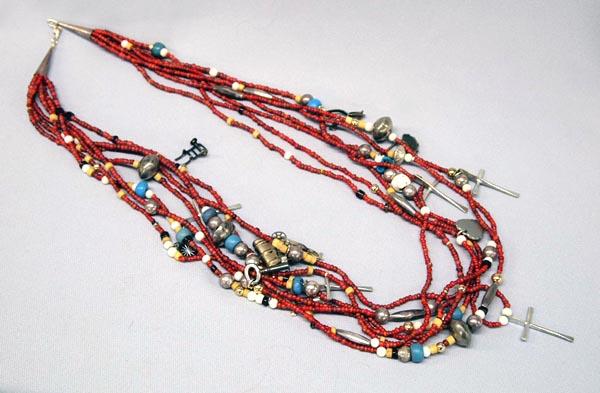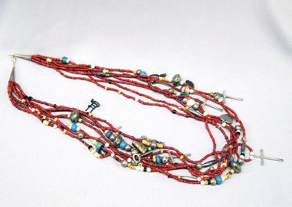 Native American Navajo Pueblo Treasure Necklace. 7 strands with tiny 19th century white heart beads and sterling silver findings and beads and crosses, and other beads and silver charms. Measures 28'' end to end. Buyers Pay Actual Shipping and Handling Charges(see terms and conditions for more information).