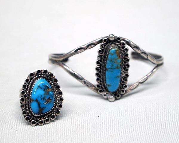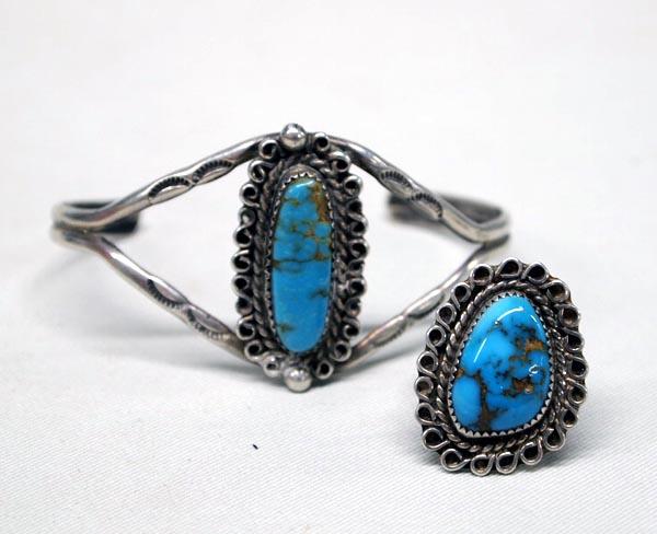 Native American Navajo Silver & Turquoise Ring and Bracelet Set, ring is size 6.5 and measures 1'' x .75'', bracelet measures 1.75'' wide and 6.25'' inside. Buyers Pay Actual Shipping and Handling Charges(see terms and conditions for more information).