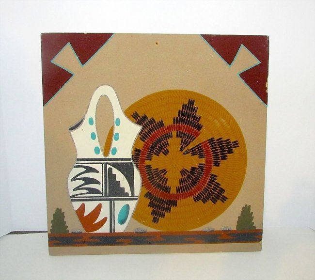 For your consideration is this exquisite vintage Navajo Sand Painting by a collectible Navajo artist, R. Watchman. This gorgeous work of art features a Navajo wedding vase and a wedding basket created on natural sand. The painting is done in warm earth tone colors with gorgeous turquoise accents. It measures 16" by 16" and is signed by the artist on the back.