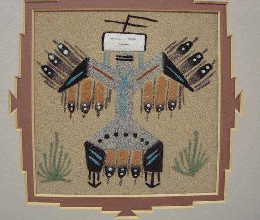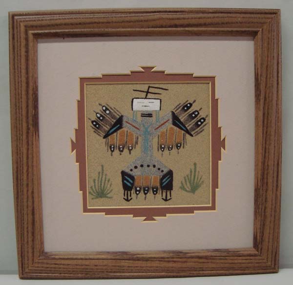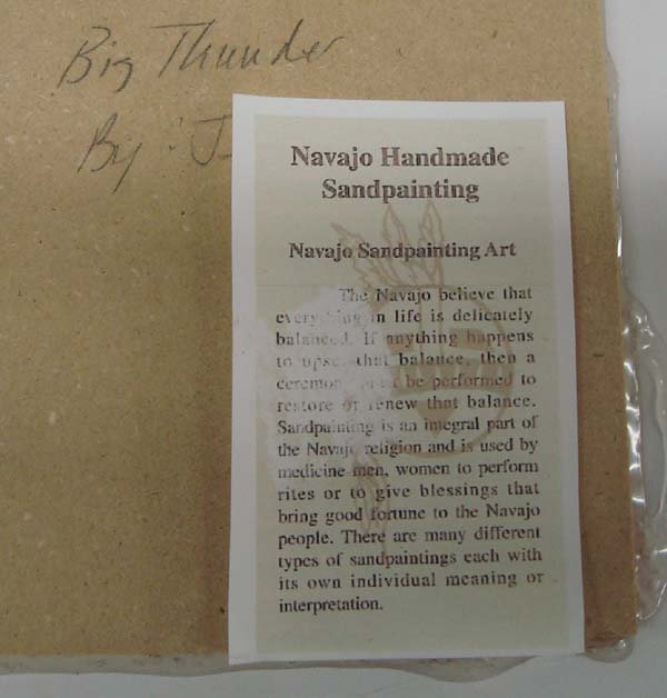 Native American Navajo Sand Painting, matted and framed, entitled "Big Thunder" by JS. 5'' x 5''. 12'' frame. Information included on the back. Small mark on outer matt. Buyers Pay Actual Shipping and Handling Charges(see terms and conditions for more information)
