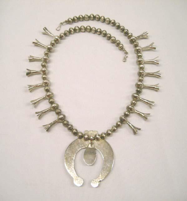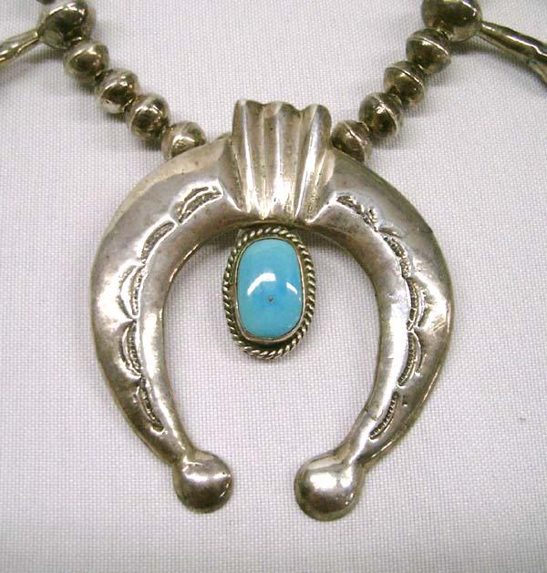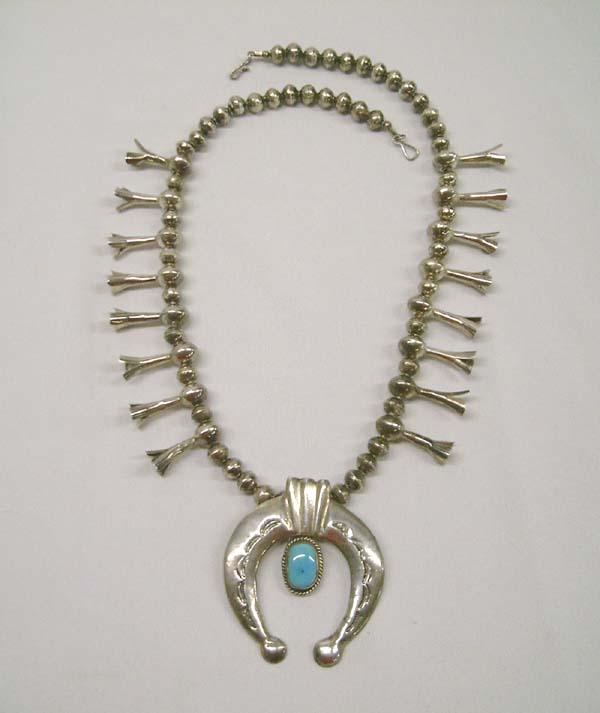 Native American Navajo Sterling Silver Sandcast Naja with Turquoise Squash Blossom Necklace. Measurement in Inches - 25 End to End Length. Naja Height 3'' / Width 2.5''. Blossom 1'' long. Stone Height .75'' / Width .5'' in Inches. Buyers Pay Actual Shipping and Handling Charges(see terms and conditions for more information).