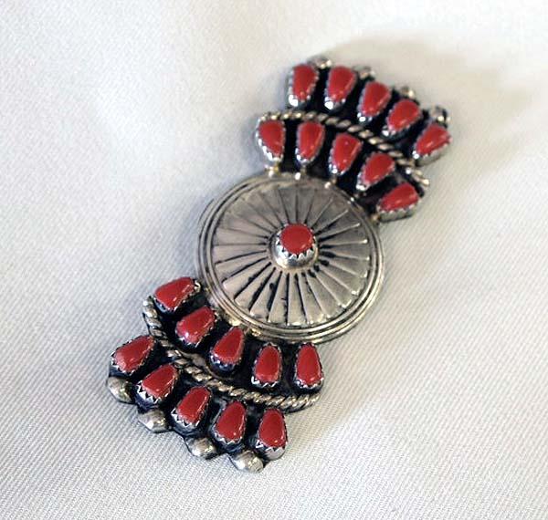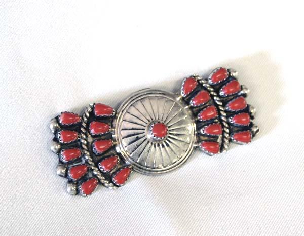 Native American Navajo Silver Coral Pin, 20 coral stones, measures approx. 2.5'' x 1''. Buyers Pay Actual Shipping and Handling Charges(see terms and conditions for more information)