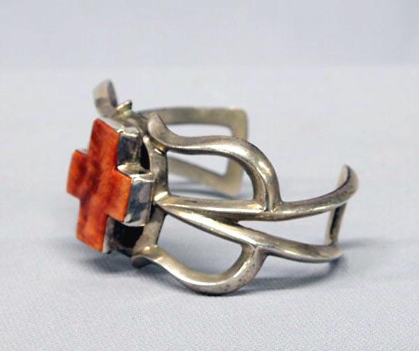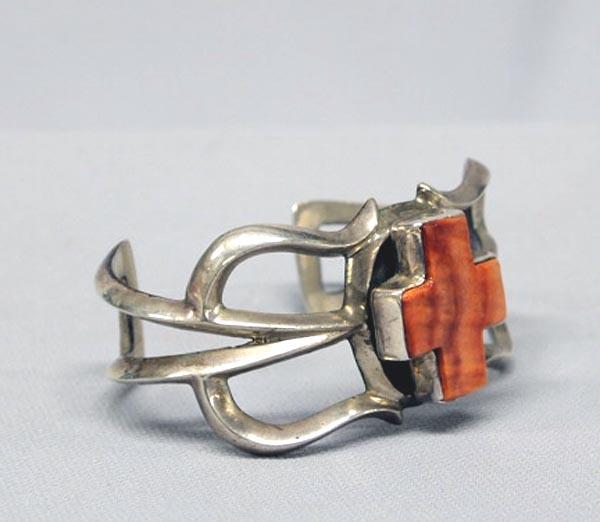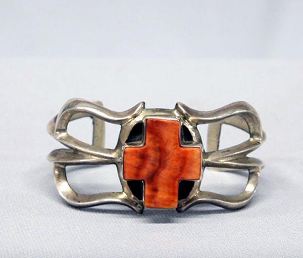 Native American Navajo Sandcast Sterling Silver With Spiny Oyster Shell Cross Bracelet. Measures 6-3/4'' opening and 1-3/8'' wide. Buyers Pay Actual Shipping and Handling Charges(see terms and conditions for more information).