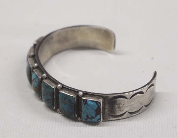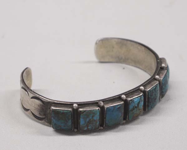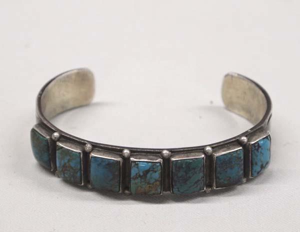 Native American Navajo Silver Turquoise Bracelet, 7 square cut all natural beautiful Colorado Turquoise Stones, inside measures 6 5/8'' and .5''W, stone measures .5" x 3/8". Buyers Pay Actual Shipping and Handling Charges(see terms and conditions for more information)