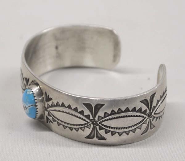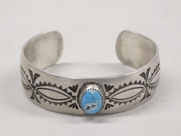 Native American Navajo Silver Turquoise Cuff Bracelet, beautifully stamped, oval turquoise stone measures .5'' x 3/8'', inside measures approx. 7'' and .5''W. Buyers Pay Actual Shipping and Handling Charges(see terms and conditions for more information)