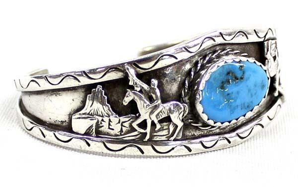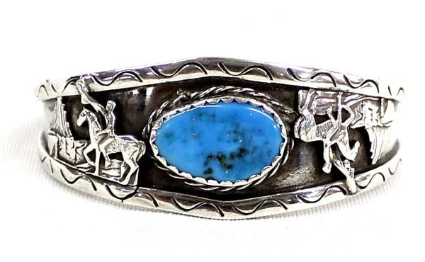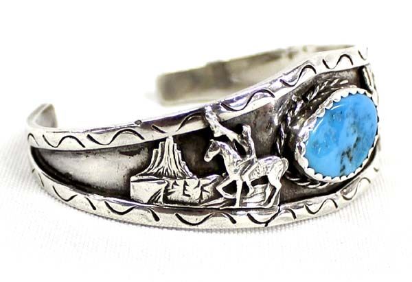 1950 Native American Navajo Sterling Turquoise Cuff Bracelet, hallmarked JHC and stamped sterling, inside measures 6.75'' which includes opening x 1'', 34g in total wt.