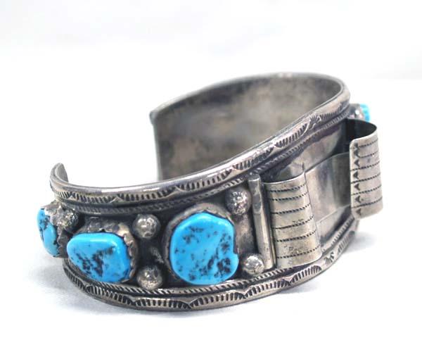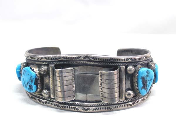Native American Navajo Silver Turquoise Watch Bracelet. Six turquoise stones. Measurement in Inches - Inside Length(Including Opening) 7'' x 1.25 Width, largest stone measures approx. 5/8'' x .5''. Buyers Pay Actual Shipping and Handling Charges(see terms and conditions for more information).