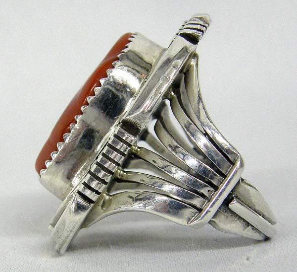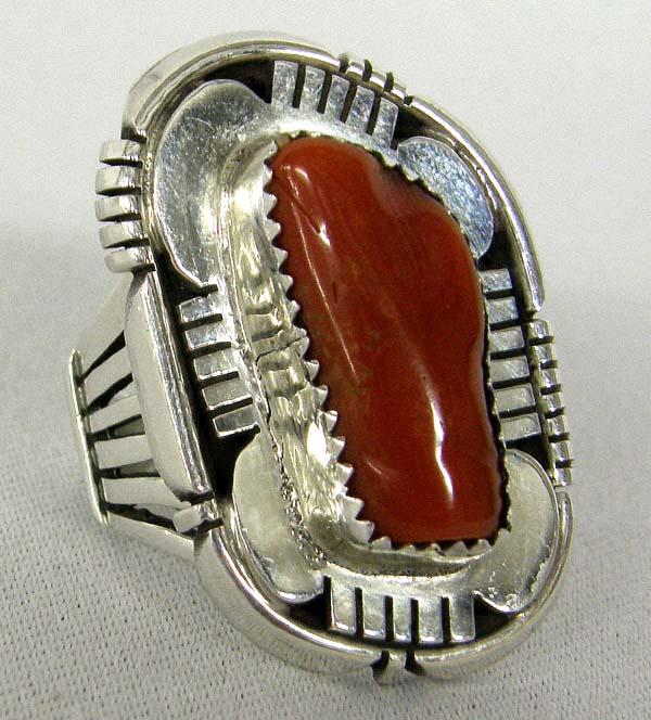 Native American Navajo Silver and Coral Ring by E. Etsitty. Approx. size 8 1/2, center measures approx. 1.25''Lx.75''W. Buyers Pay Actual Shipping and Handling Charges(see terms and conditions for more information).