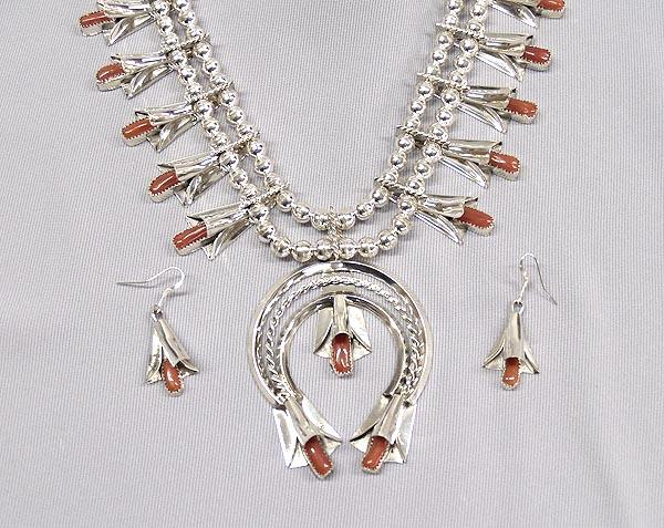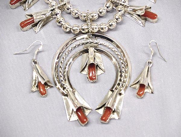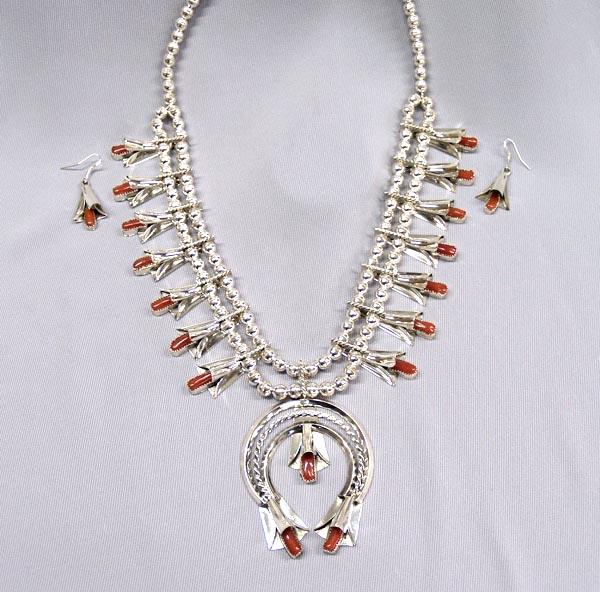Native American Navajo Sterling Silver Coral Squash Blossom Necklace and Earrings by Louise & Frank Yazzi, 17 blossoms, measures approx. 25'' end to end, naja measures 2.75'', blossoms measure 2'' and earrings measure 1.25'' x .75'', largest stone measures .75'' x .25''. Buyers Pay Actual Shipping and Handling Charges(see terms and conditions for more information)