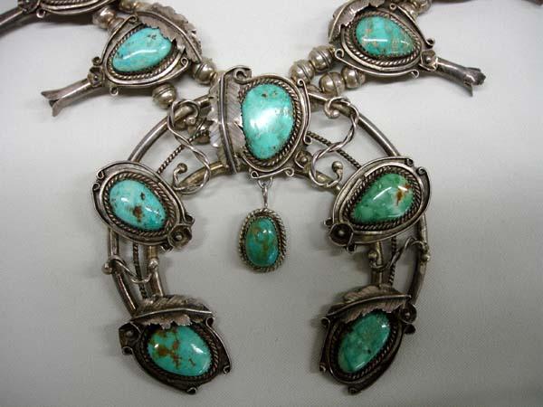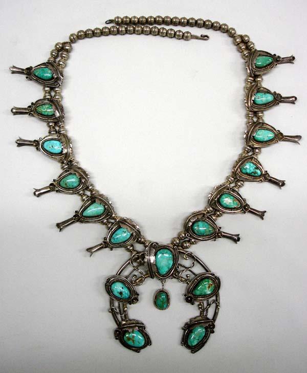Navajo Sterling Silver Squash Blossom Necklace Natural Turquoise. There are 18 natural turquoise nuggets. The necklace measures 26'' end to end and the Naja is 3.5''x3.5''. On the back of the Naja is the hallmark ''MW for Michael Watchman. Buyers Pay Actual Shipping and Handling Charges(see terms and conditions for more information).