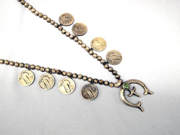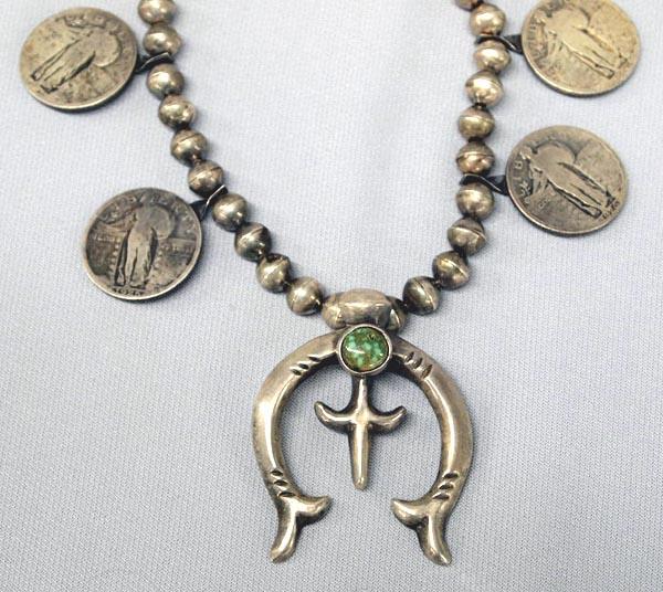 Native American Navajo Coin Squash Blossom Necklace. Coins are quarters dated 1925-29. Spiderweb turquoise stone in Naja. Measures 26'' end to end. Naja is 2.25''x1-5/8''. Buyers Pay Actual Shipping and Handling Charges(see terms and conditions for more information).