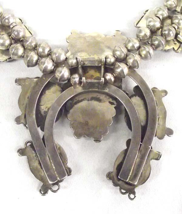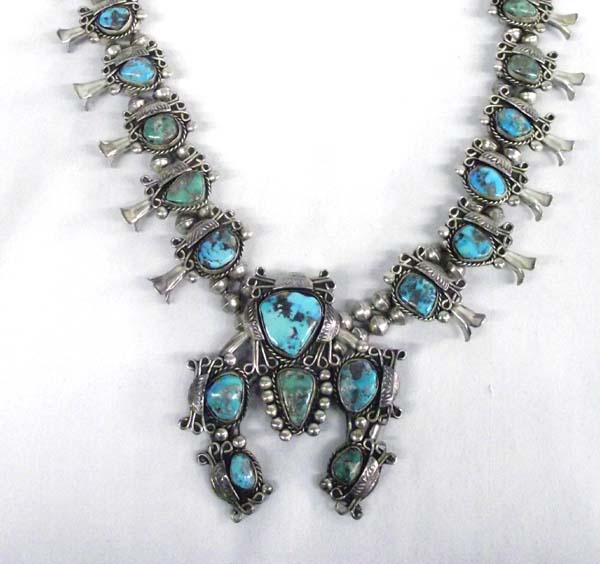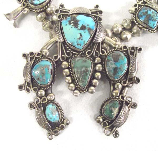 Native American Navajo Silver Turquoise Squash Blossom Necklace, repousse' silverwork, Colorado Turquoise, measures approx. 29.5''L end to end, blossoms 1.25'' x 1'', and naja 4'' x 3''. Buyers Pay Actual Shipping and Handling Charges(see terms and conditions for more information)