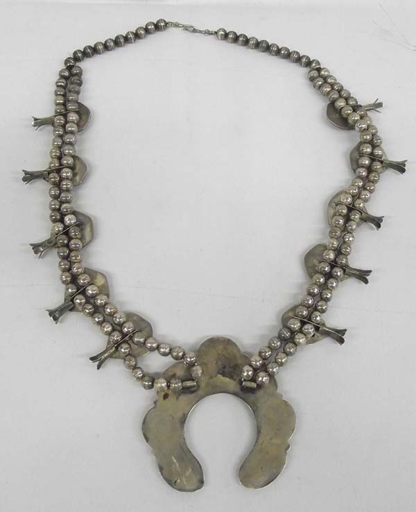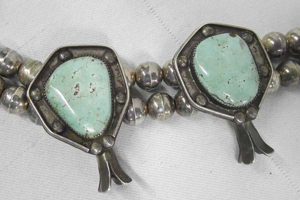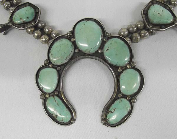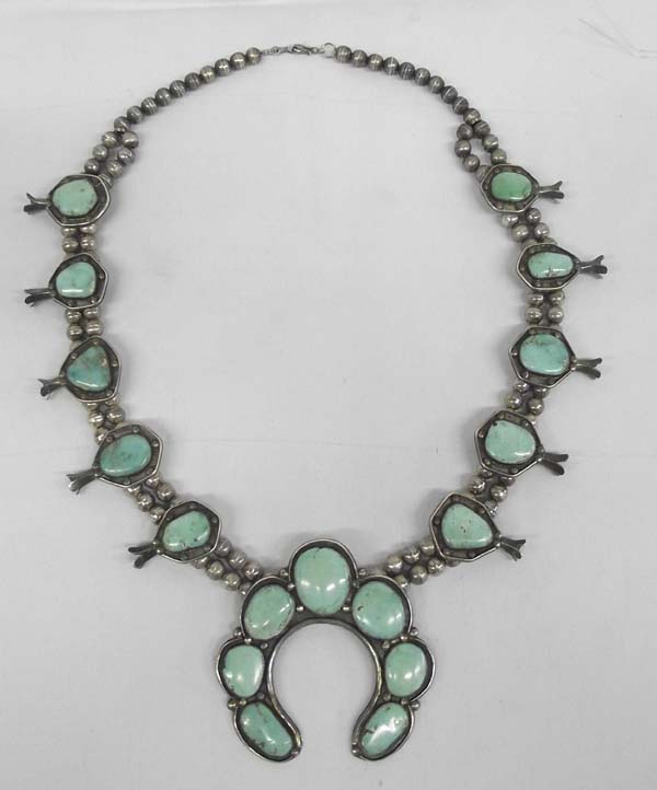 Native American Navajo Squash Blossom Necklace. Early natural Morenci Turquoise in shadowbox. Necklace measures approx. 29 1/2'', naja measures approx. 3 1 /2'' x 3 1/2'', largest stone measures approx. 1'' x 1''. Buyers Pay Actual Shipping and Handling Charges(see terms and conditions for more information).
