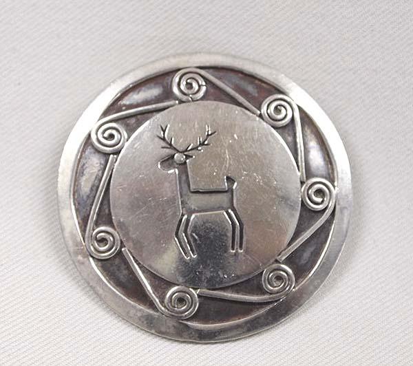 Native American Navajo Sterling Silver Deer Pin, marked ''W''. Measures approx. 1 1/2'' diameter. Buyers Pay Actual Shipping and Handling Charges(see terms and conditions for more information).