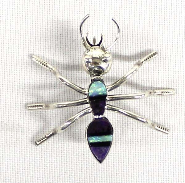 Native American Navajo Sterling Channel Inlay Ant Pin by Richard Begay, measures .5''H x 1.5''L x 1.75''W, hallmarked RB and stamped sterling, inlay of opal, sugilite, and jet