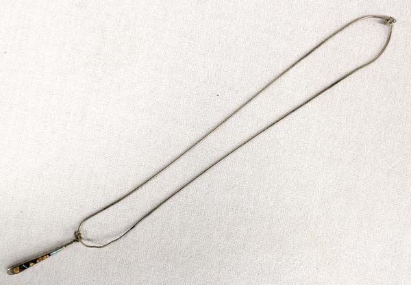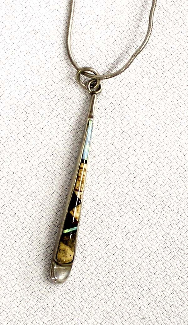 Beautiful Native American Navajo Sterling Inlay Necklace by Calvin Begay, sterling chain measures 19''L end to end and pendant measures 2''L, inlay includes opal and jasper, hallmarked and stamped sterling, ''Calvin Begay is an award winning artist, jeweler, designer and master craftsman.''