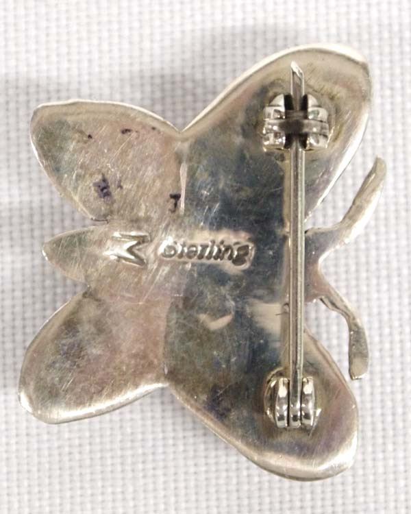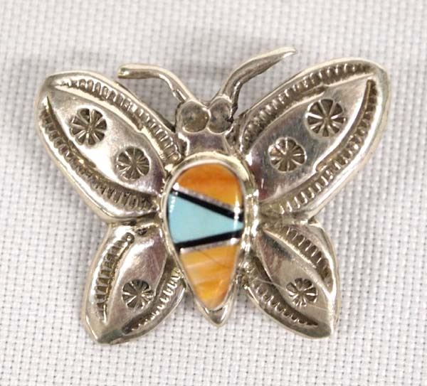 Native American Navajo Sterling Silver Inlay Butterfly Pin, measures 1'' x .75'', inlay consists of red shell and turquoise, hand stamped details, hallmarked M and stamped sterling