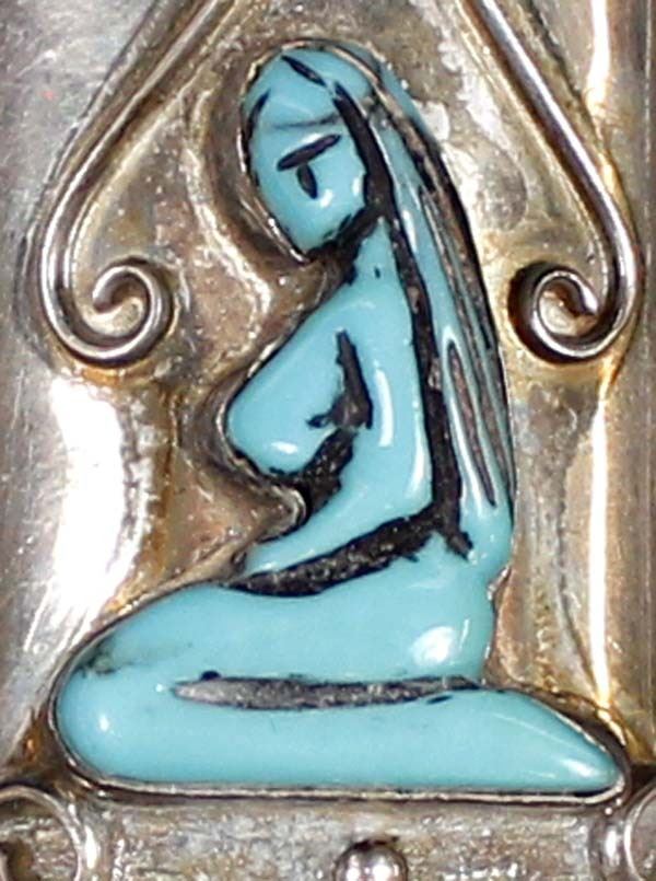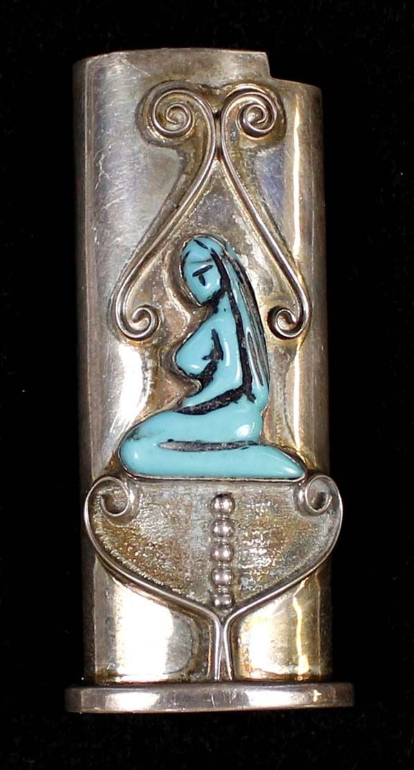 Vintage Native American Navajo Sterling & Carved Turquoise Silver Lighter Cover, measures 2.75''L x 1.25''W x 5/8''Deep, features a carved turquoise nude woman, bottom is hallmarked
