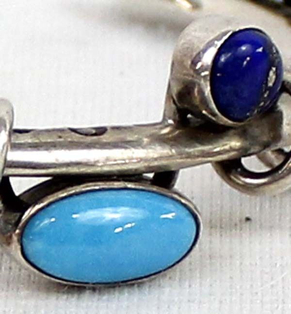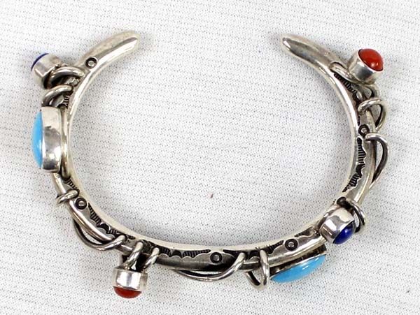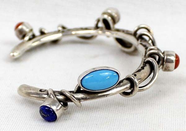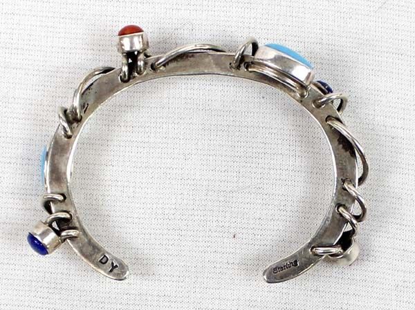 Contemporary Native American Navajo Sterling Turquoise Lapis & Coral Bracelet by Dudley Yazzie, inside measures 6.5'' which includes the gap x .5'', hallmarked DY and stamped sterling, very beautiful and unusual bracelet, 25.28gtw
