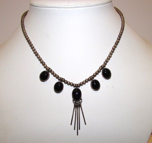 For your consideration is this outstanding vintage Navajo sterling silver beaded necklace with oval onyx cabochons. This gorgeous piece features a classic beaded design in sterling silver accented with 5 oval onyx cabochons and a sterling silver fringe. This stylish necklace measures 21" total length including the fringe. The necklace is marked "sterling" on the inside and is stamped "E" with the artist's hallmark.