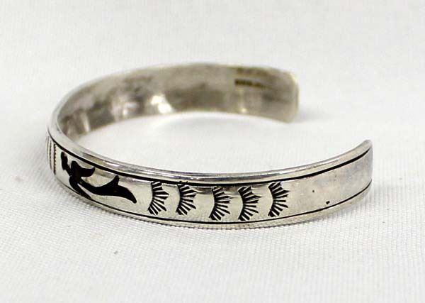 Native American Navajo Sterling Silver Bracelet by Gilo Nakai, inside measures 6 3/8'' which includes the opening x .25'', hallmarked and stamped sterling, hand stamped details