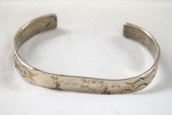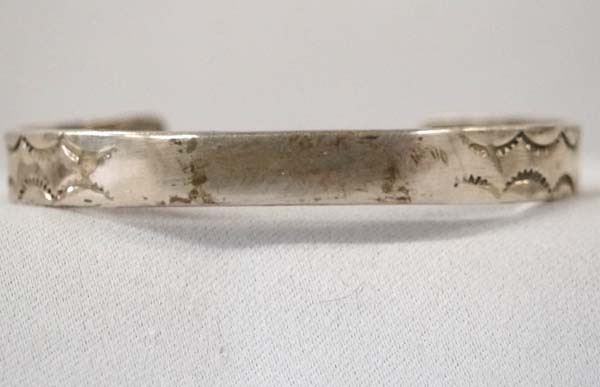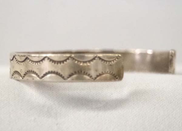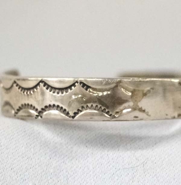 Native American Navajo Sterling Silver Cuff Bracelet, inside measures 7'' which includes opening x .25''W, hand stamped designs