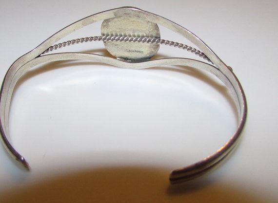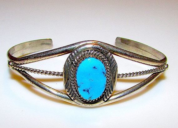 For your consideration is this wonderful Navajo sterling silver and Kingman mine turquoise cuff bracelet. This wonderful example of vintage Native American art features a classic, traditional Navajo design in sterling silver and is accented with a gorgeous Kingman mines turquoise cabochon. The piece has no visible artist's hallmarks and is stamped sterling. The bracelet is a little under 1" wide and inside circumference is about 6" including gap, the gap is 1 1/4" wide. The cuff can be carefully adjusted. Stunning addition to any collection!