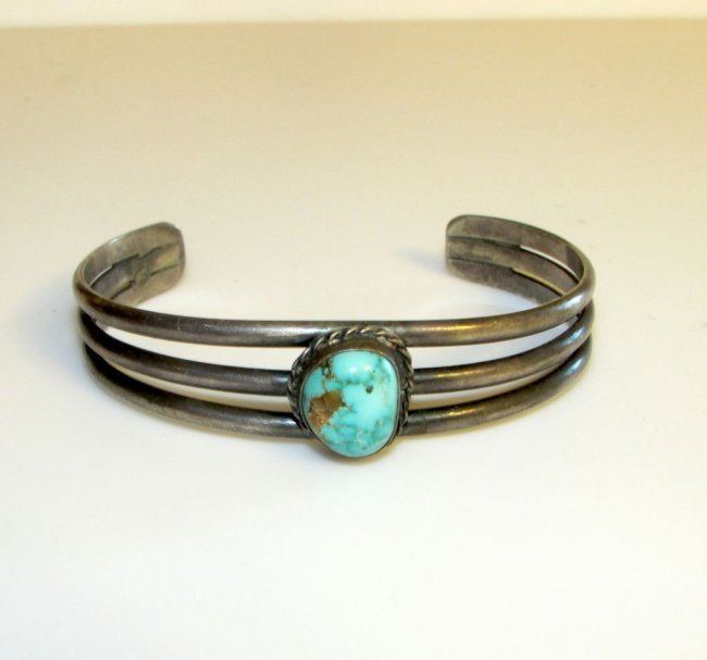 NO BUYER PREMIUM! EASY IN HOUSE SHIPPING!For your consideration is this gorgeous vintage Native American Navajo sterling silver and turquoise cuff bracelet in wonderful vintage condition. This beautiful cuff features a classic design in sterling silver accented with stunning blue turquoise cabochon. The bracelet measures about 1" at the widest point and has about 6 1/2" inside circumference including the gap. The bracelet can be carefully adjusted.