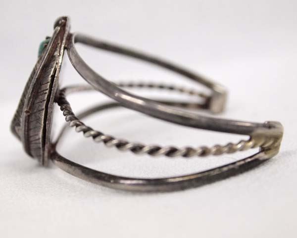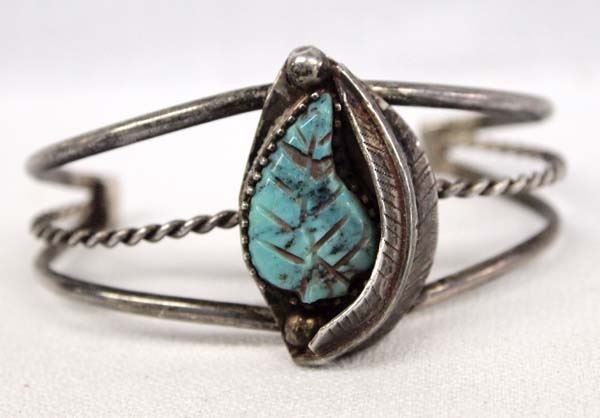 Native American Navajo Sterling Turquoise Bracelet, inside measures 5.75'' which includes opening x 1.25''W, features beautiful carved turquoise leaf, 16.74g in total wt.