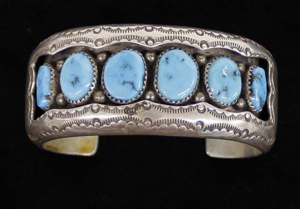 Stunning Native American Navajo Sterling Silver Turquoise Bracelet by B. Touchine, shadowbox style featuring 6 gorgeous turquoise cabochons with largest measuring .5'' x .5'', hallmarked and stamped sterling, beautiful hand stamped details, 47.68g in total wt.