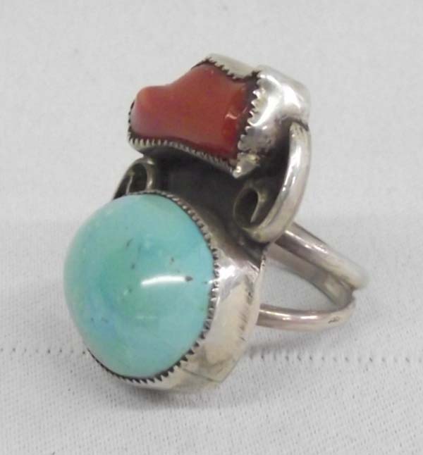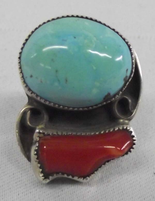 Native American Navajo Sterling Silver Turquoise Coral Ring Size 6 1/4. Measures approx. 1''L x 3/4''W, largest stone measures approx. 1/2''L x 3/4''W. Buyers Pay Actual Shipping and Handling Charges(see terms and conditions for more information).
