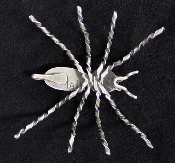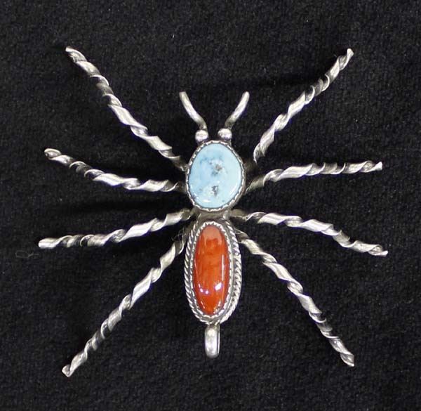 Vintage Native American Navajo Sterling Turquoise and Coral Spider Pendant, measures 2'' x 2'', unique twisted silver legs, hallmarked, Little White Dove Trading