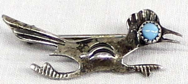 Native American Navajo Sterling Turquoise Roadrunner Pin, measures 1.25''L x .5''H