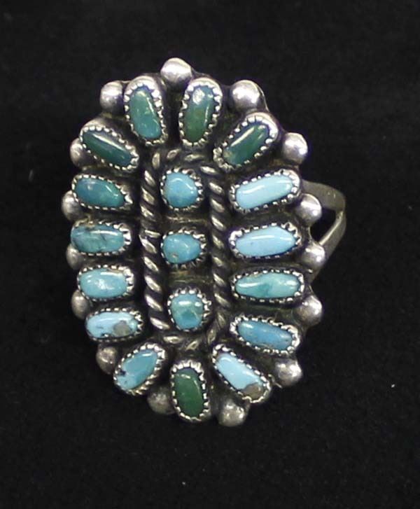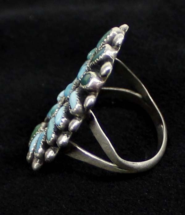Vintage Native American Navajo Sterling Turquoise Cluster Ring, Size 8, measures 1.25''L, beautiful aged green turquoise, very flattering on, ca. 1960s Little White Dove Trading