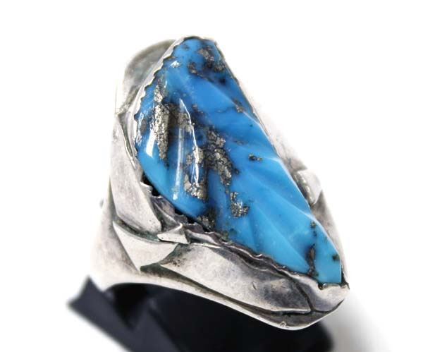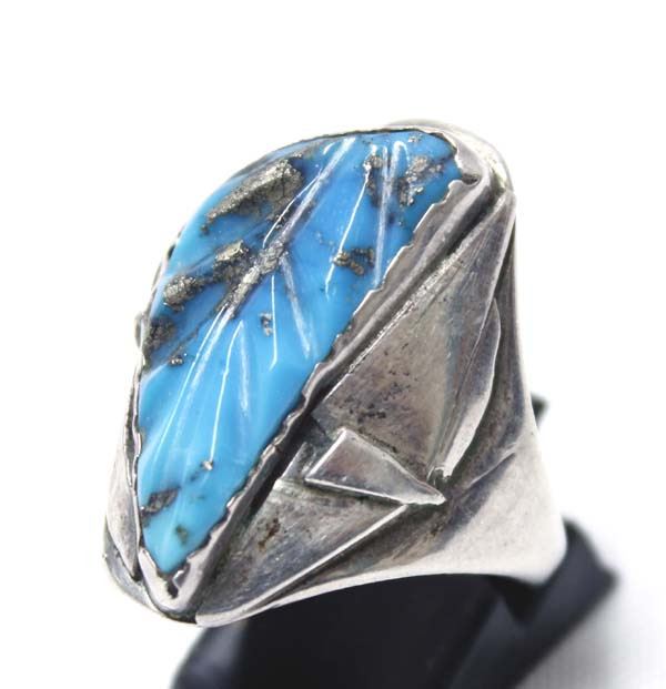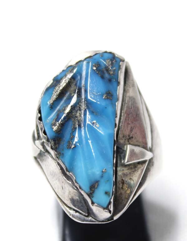 Native American Navajo Sterling Silver and Carved Turquoise Ring, size 10.5 and measures 1.25''L x 1''W, features a carved turquoise leaf measuring 1''L, 13.42g in total wt.