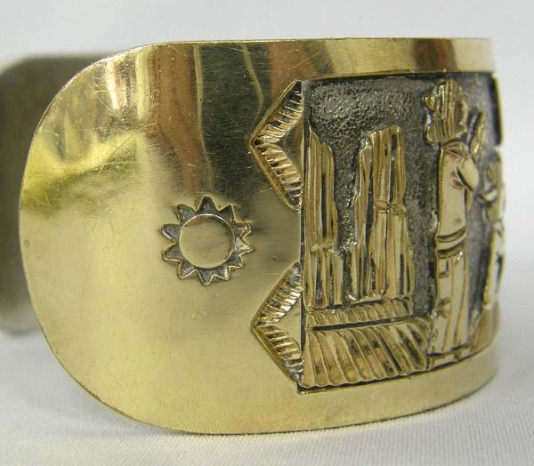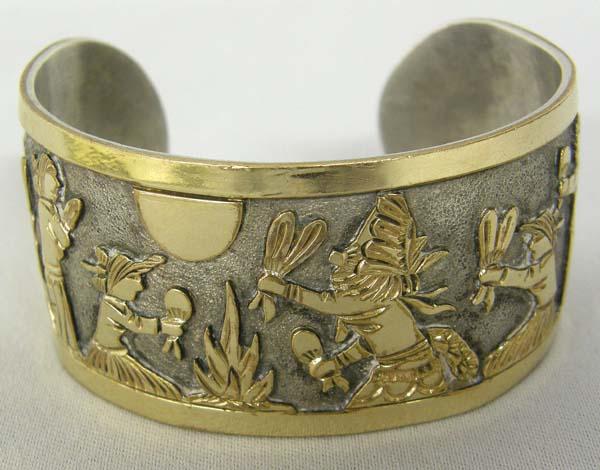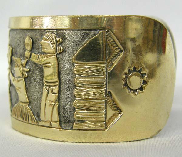Native American Navajo Gold Overlay on Sterling Silver Storyteller Cuff Bracelet by Becenti, hallmarked BCT with a tomahawk stamp, and 1/20 12Kt G.F., measures approx. 6.75'' inside and 1.25''W. Buyers Pay Actual Shipping and Handling Charges(see terms and conditions for more information)