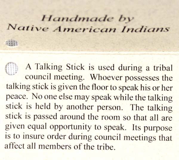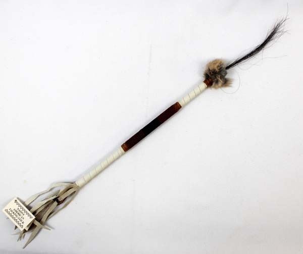 Native American Navajo Talking Stick, measures 16''L x 4'' x 3.5'', embellished with rabbit fur, horse hair, feathers, beads, and leather, leather wrapped and beaded, ''The Talking Stick is used during a tribal council meeting. Whoever possesses the talking stick is given the floor to speak his or her peace. No one else may speak while the talking stick is held by another person. The talking stick is passed around the room so that all are given equal opportunity to speak. Its purpose is to insure order during council meetings that affect all members of the tribe.''